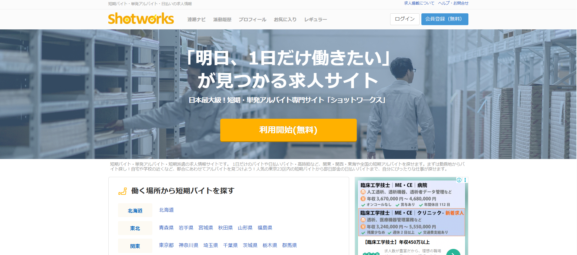 「ショットワークス」は短期・単発アルバイト専門アプリ/サービスです。PCでもスマホでもどちらでも利用できます。