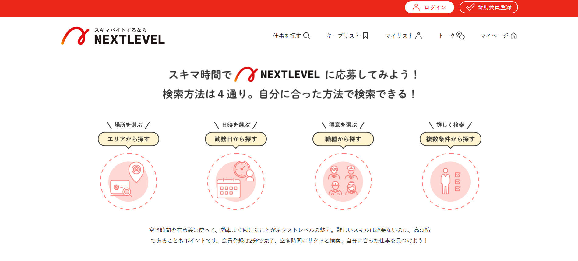 「ネクストレベル」はスキマ時間の仕事が見つかるアプリ/サービスです。アプリはもちろん、サイトから利用も可能です。