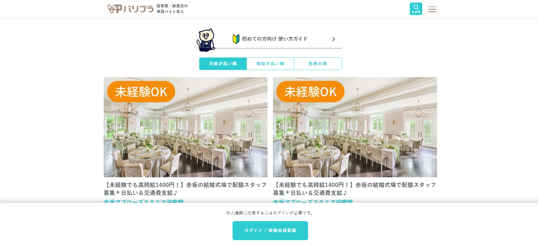 飲食や接客のバイトがしたいなら、「バリプラ」がおすすめです。ホテル・ブライダル・レストラン・カフェ・居酒屋などの求人が多数あります。未経験でも高時給の求人が多いのもうれしいポイントです。