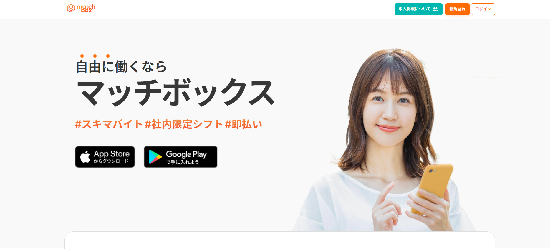 「マッチボックス」も利用者の多いスキマバイトが探せるアプリ/サービスです。単発の仕事をあちこちで経験したい人よりも、慣れた場所で好きなタイミングで働きたいと考えている人にぴったりです。