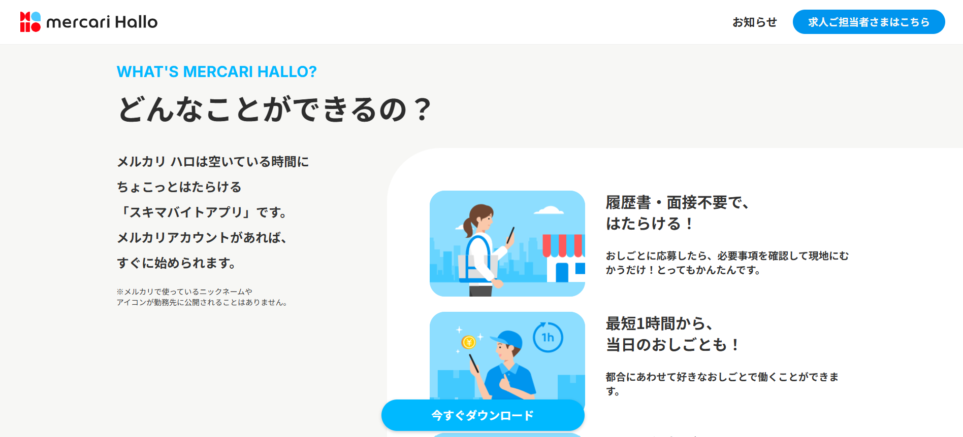 「メルカリハロ」は、スキマ時間の単発バイトを探して応募できるアプリ/サービスです。定番フリマアプリ「メルカリ」の関連アプリ/サービスです。2024年スタートと新しいサービスですが、利用者もどんどん増えています。