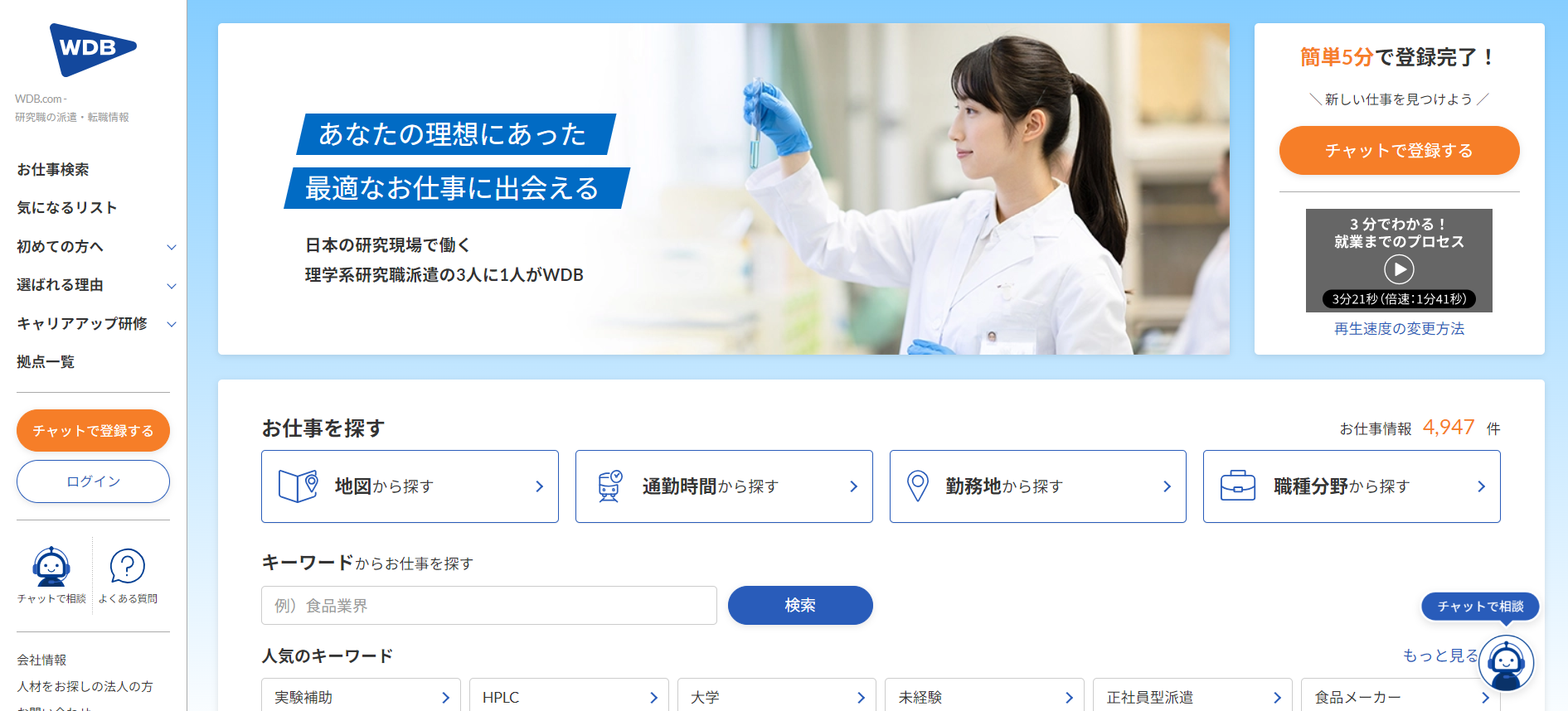 愛媛県などで研究職として転職したい時に、求人情報を多く掲載しているのが「WDB」です。研究職に特化している転職エージェントで、愛媛県内の情報も豊富に揃っています。