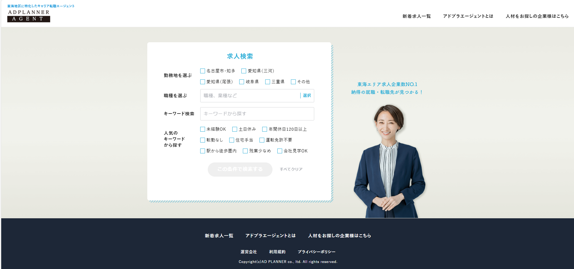 全国に拠点があり地方の求人も充実しているので、大都市圏以外で仕事を探している人にも適しています。東海エリアは、関西エリア・九州エリアと並んで特化したページもあります。