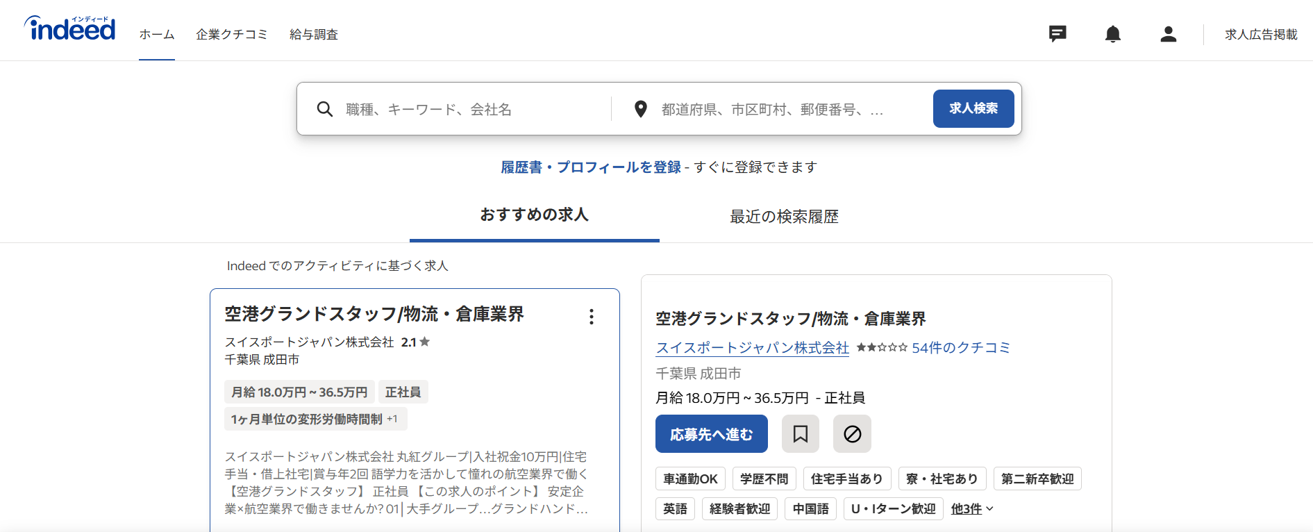 「Indeed(インディード)」は、世界最大級の求人検索エンジンで、建設業界の求人情報も豊富に掲載されています。その業界だけでも求人数は12万件以上にのぼります。