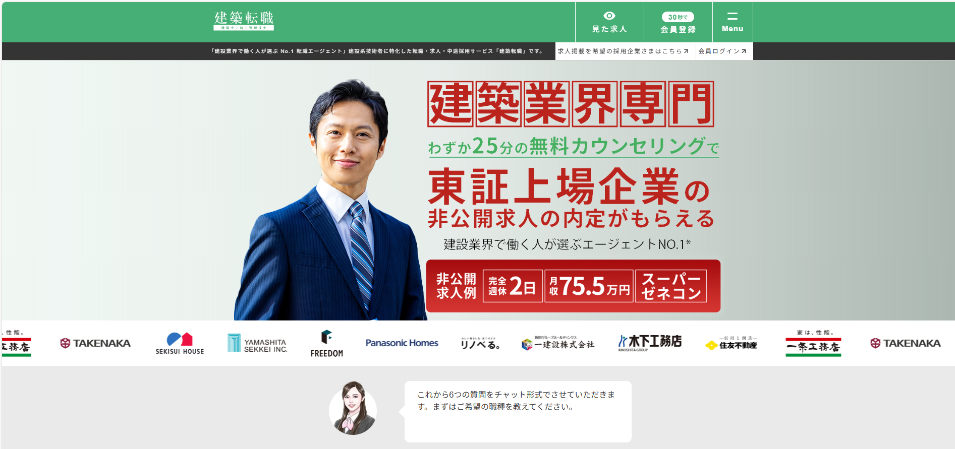次に、建築から転職するのにおすすめの大手の総合型転職サービスをご紹介します。以下の6つのサービスです。