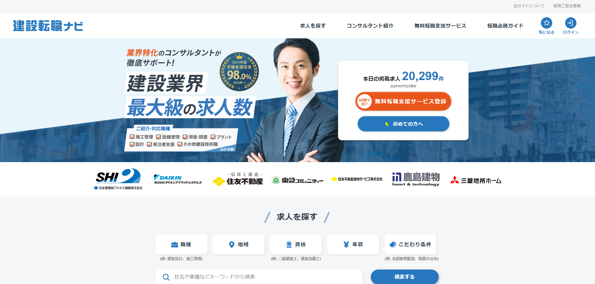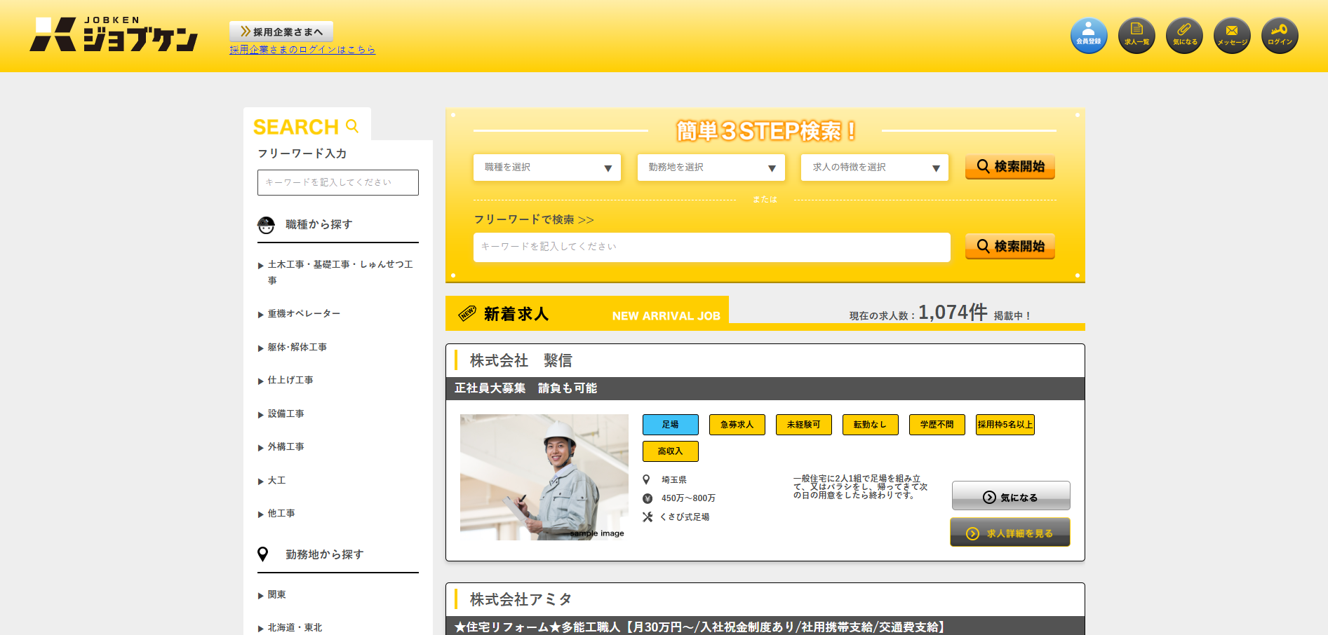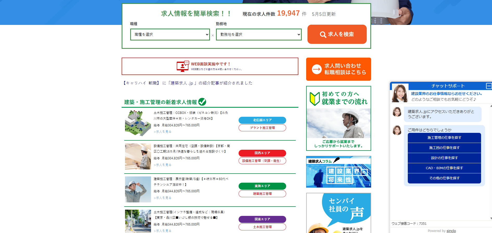 建設業界におけるスキルに特化した求人も多く、雇用形態のアイコン検索や特集ページなど機能的なサイト構成が特徴です。