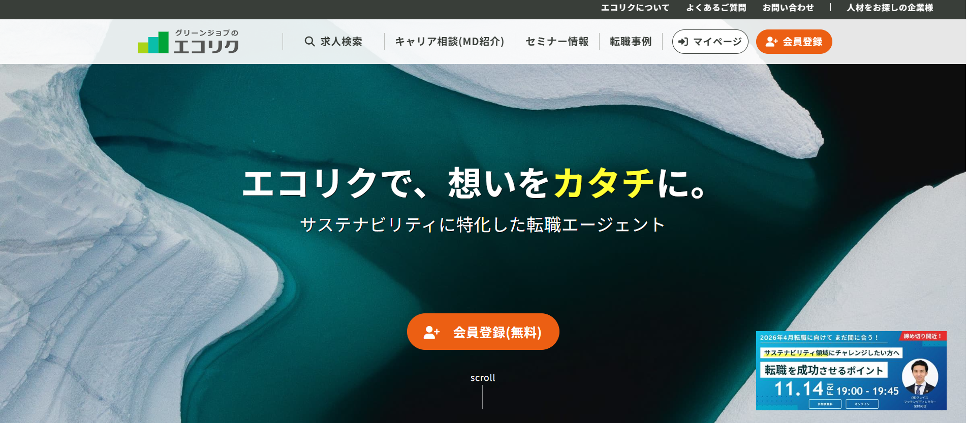 「エコリク」は、サステナビリティ(ESG)や環境分野に特化した転職エージェントで、約30年の実績を持ちます。日本初の環境・社会課題を解決する「グリーンジョブ」に特化し、再生可能エネルギー、廃棄物・リサイクル、企業のCSR対応などの求人を取り扱っています。