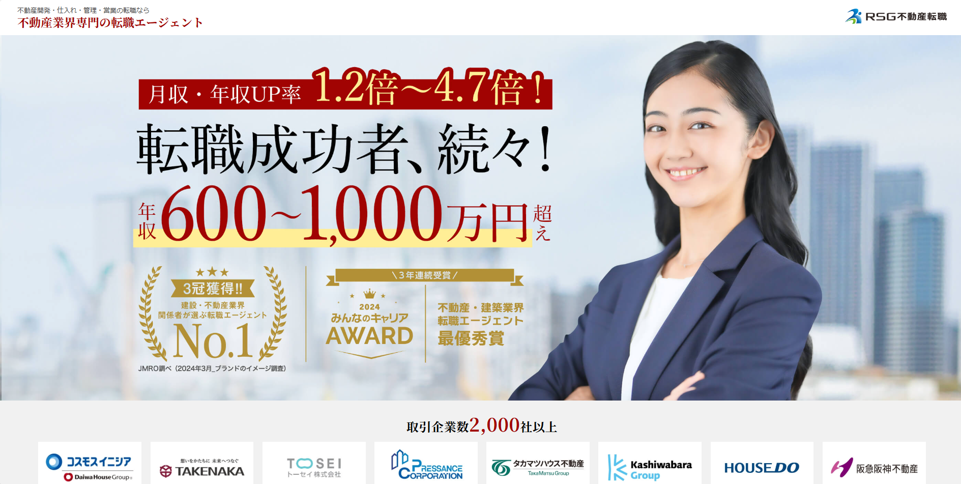 「RSG不動産転職」は、不動産業界に特化した転職エージェントで、業界出身のコンサルタントによる高いマッチング力が特徴です。常時15,000件を超える求人案件を保有し、収入UP率99.4%、平均1.2倍~4.7倍の年収アップ実績があります。