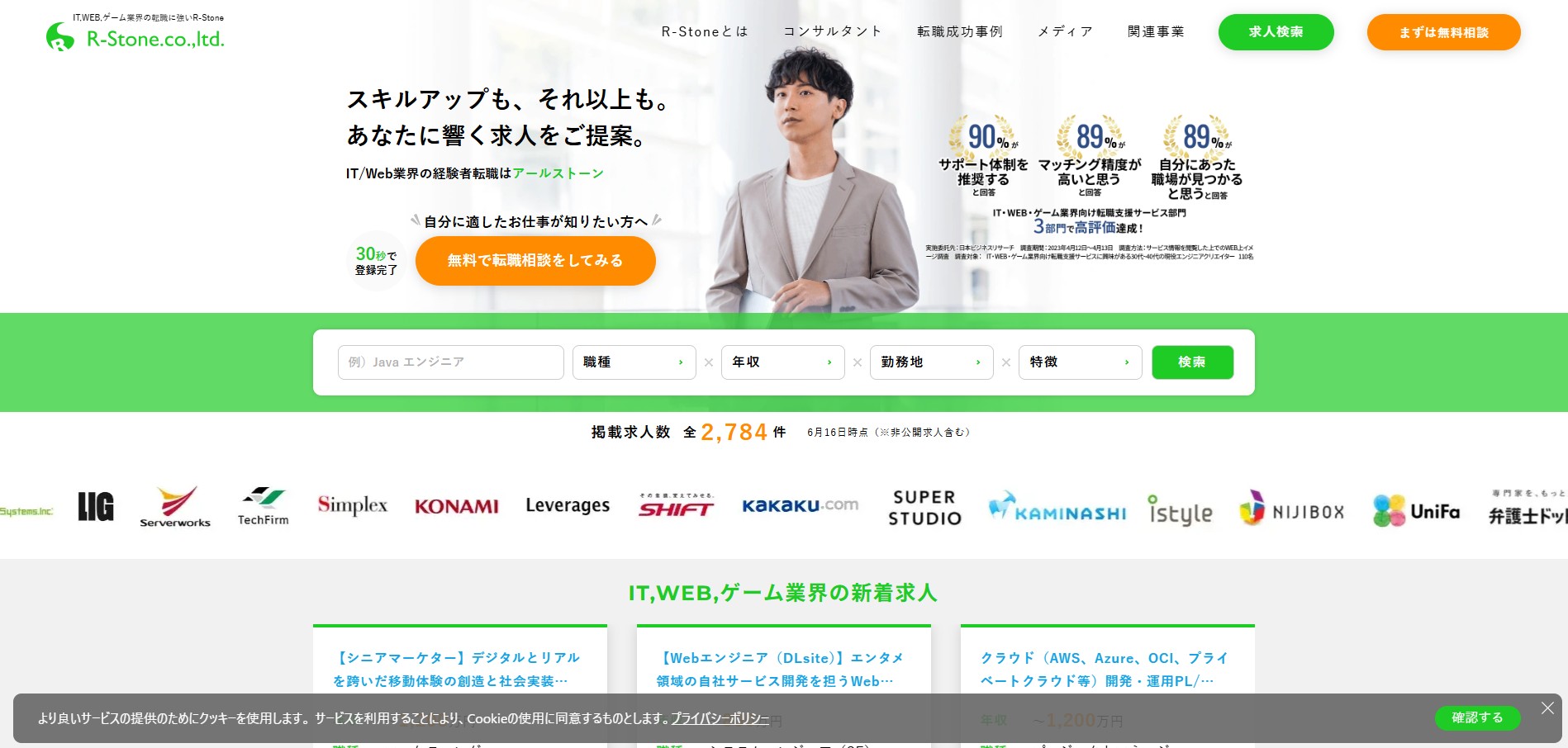 転職エージェントとしても利用でき、非公開求人も数多く保有。サイトが見やすく使いやすいのも特長です。職種別のページやエリア別のページにもすぐに移動でき、検索するのも楽でしょう。