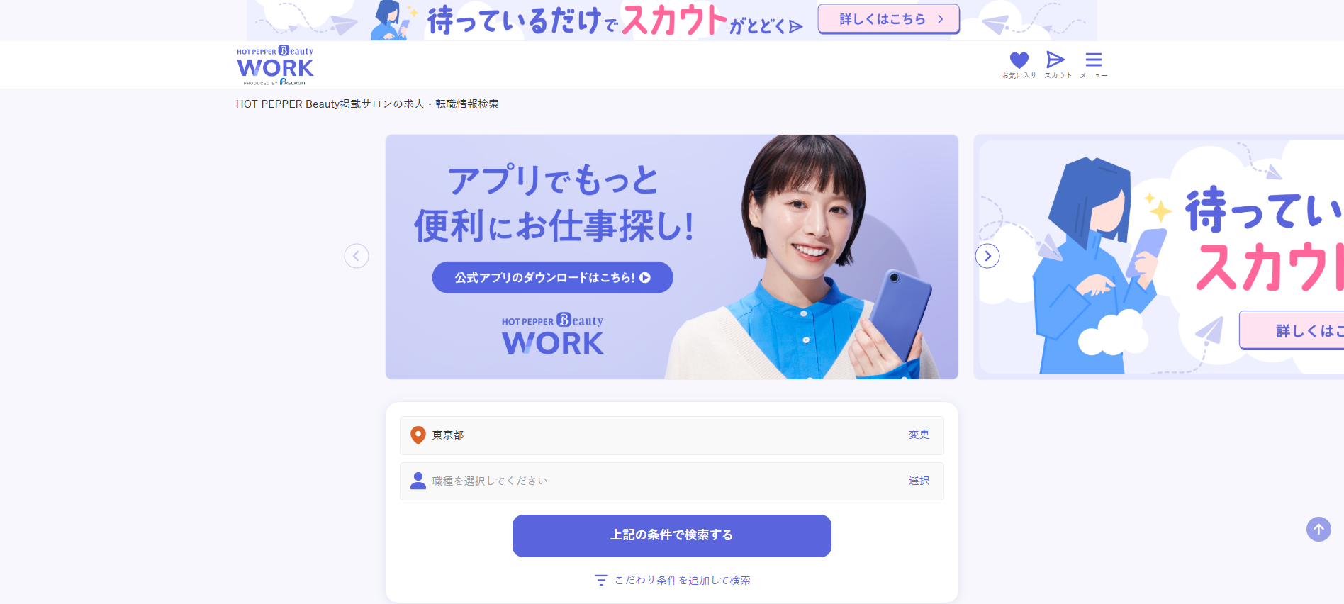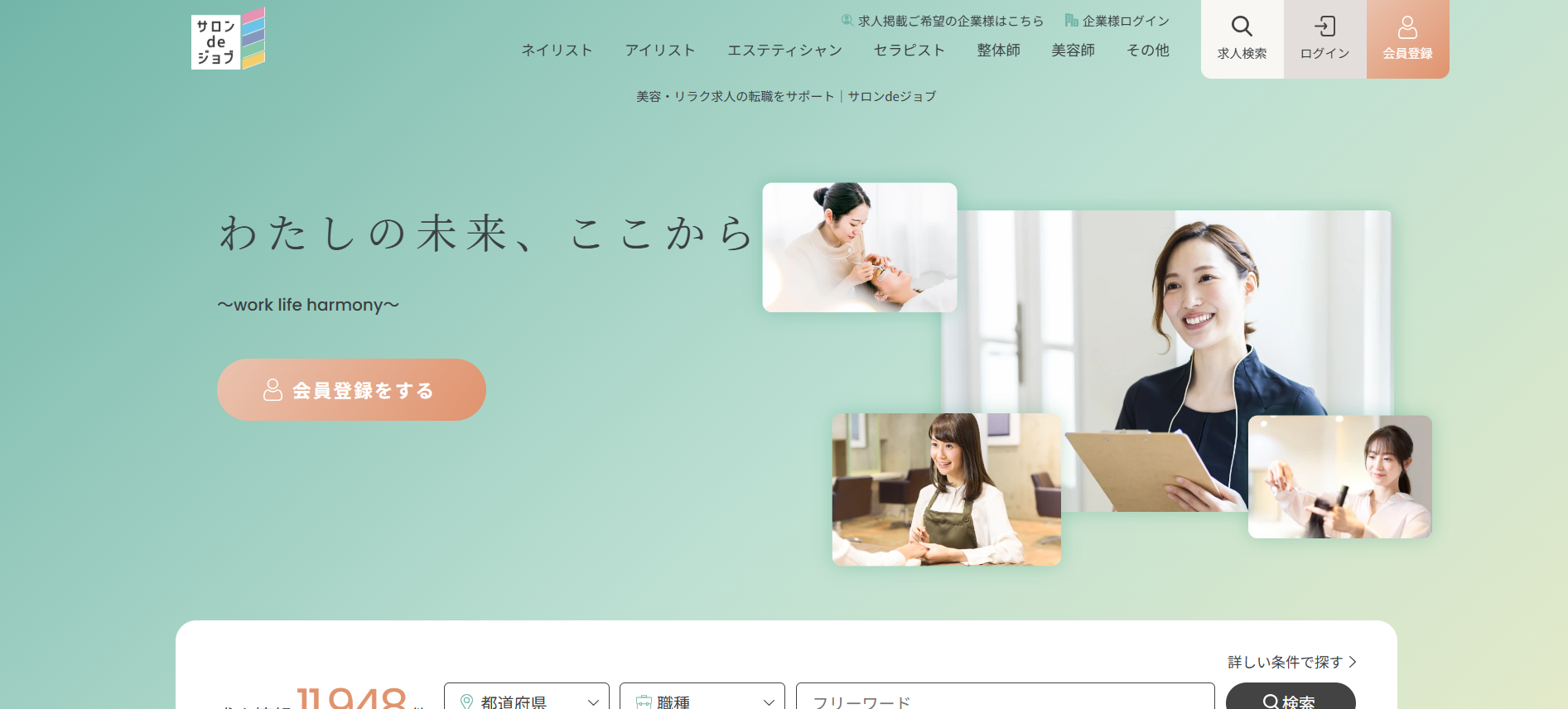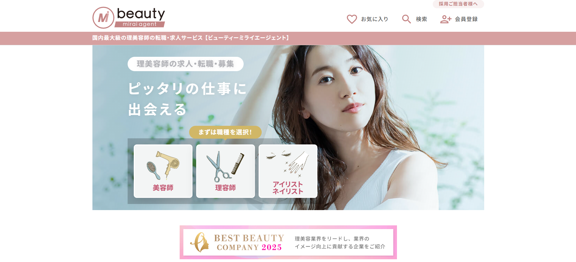 トップページからすぐに職種別のページに移動でき、美容など希望の職種の求人がチェックしやすくなっています。転職エージェントとの一体型なので、アドバイザーのサポートも受けることが可能です。