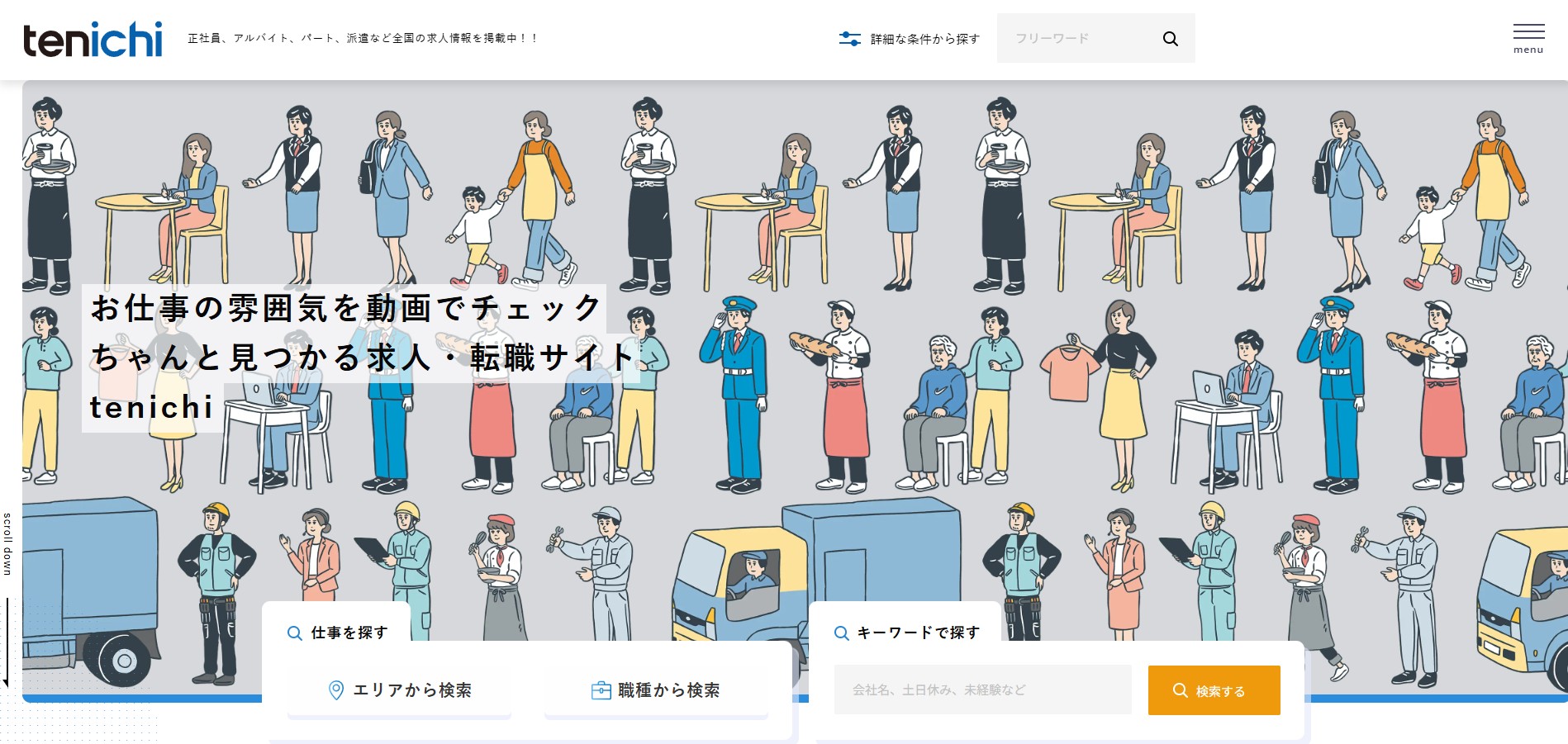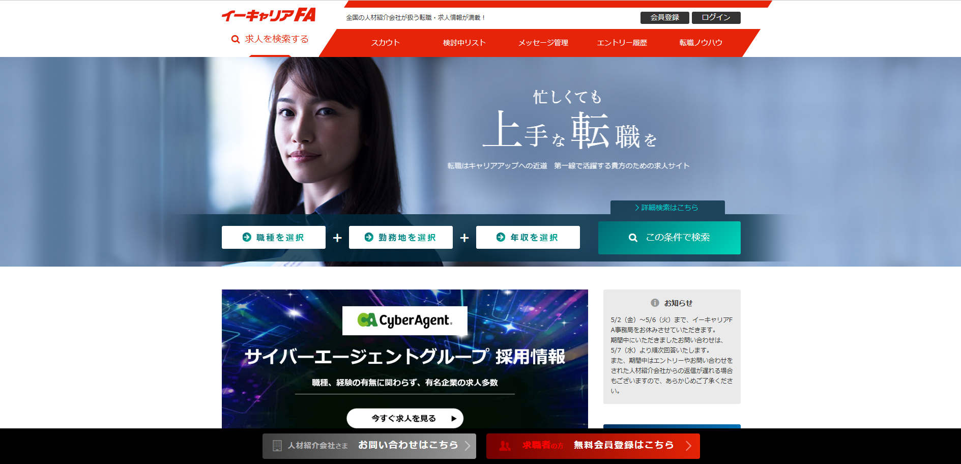転職エージェントとしても利用でき、非公開求人も数多く保有。サイトが見やすく使いやすいのも特長です。職種別のページやエリア別のページにもすぐに移動でき、検索するのも楽でしょう。
