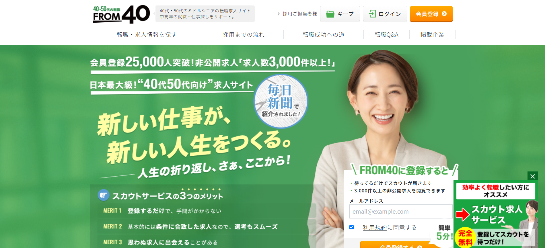 人生経験豊富な中高年転職者や求職者を求めている企業に着目し、40代・50代以上の方を対象とした求人情報だけを厳選して掲載。非公開求人数は3,000件以上を保有しており、幅広い選択肢から希望に合った求人が見つかるはずです。