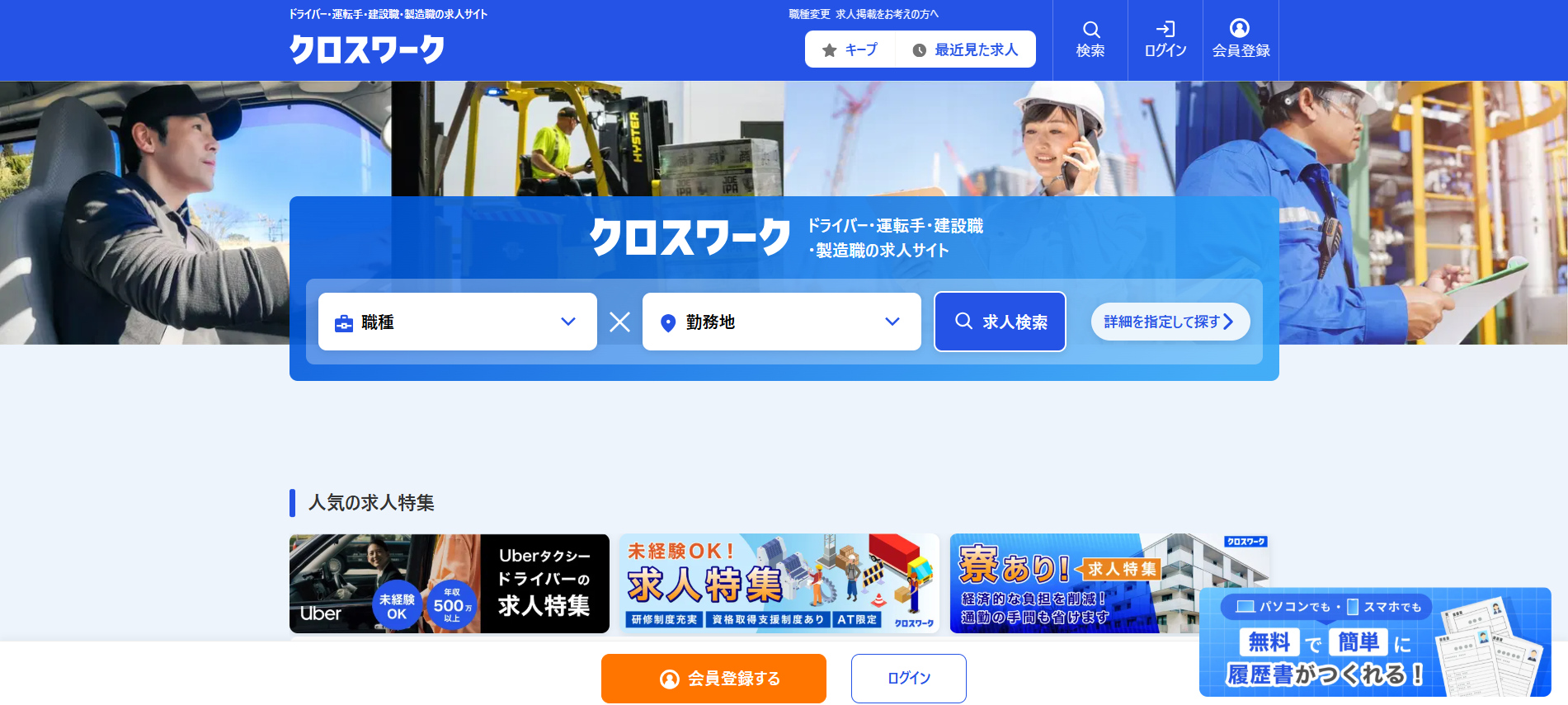 履歴書や職務経歴書のサポートが充実。初めての転職や警備員から未経験の職種希望でも安心して利用可能です。いくつかの業界については特化型のページもあります。全国に拠点があり、大都市圏以外で仕事を探している人にも最適です。