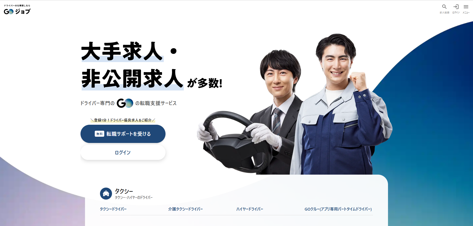 「GOジョブ」は、タクシーアプリ『GO』を運営するGO株式会社が提供する、ドライバー職に特化した転職支援サービスです。タクシー、トラック、バス、配送、自動車整備士など、幅広い職種の求人情報を掲載しています。