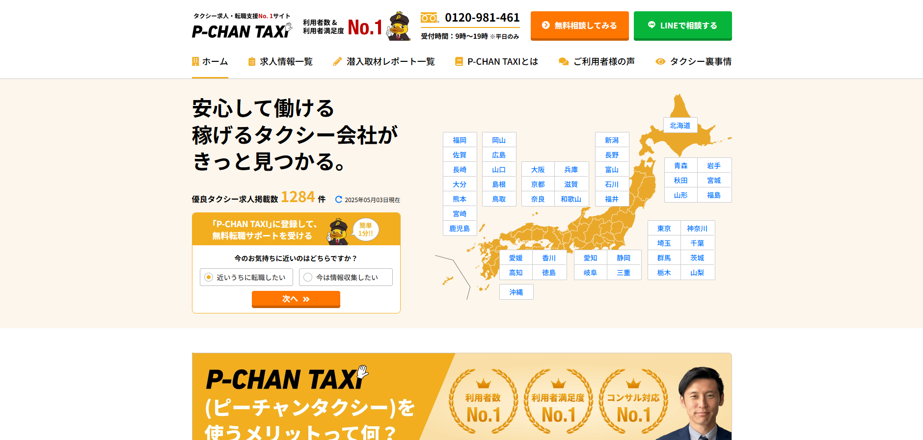 「P-CHAN TAXI(ピーチャンタクシー)」は、株式会社ピーアール・デイリーが運営する、タクシードライバー専門の無料転職支援サービスです。タクシー業界に詳しいコンサルタントが、各タクシー会社との人脈を活かして転職をサポートしています。