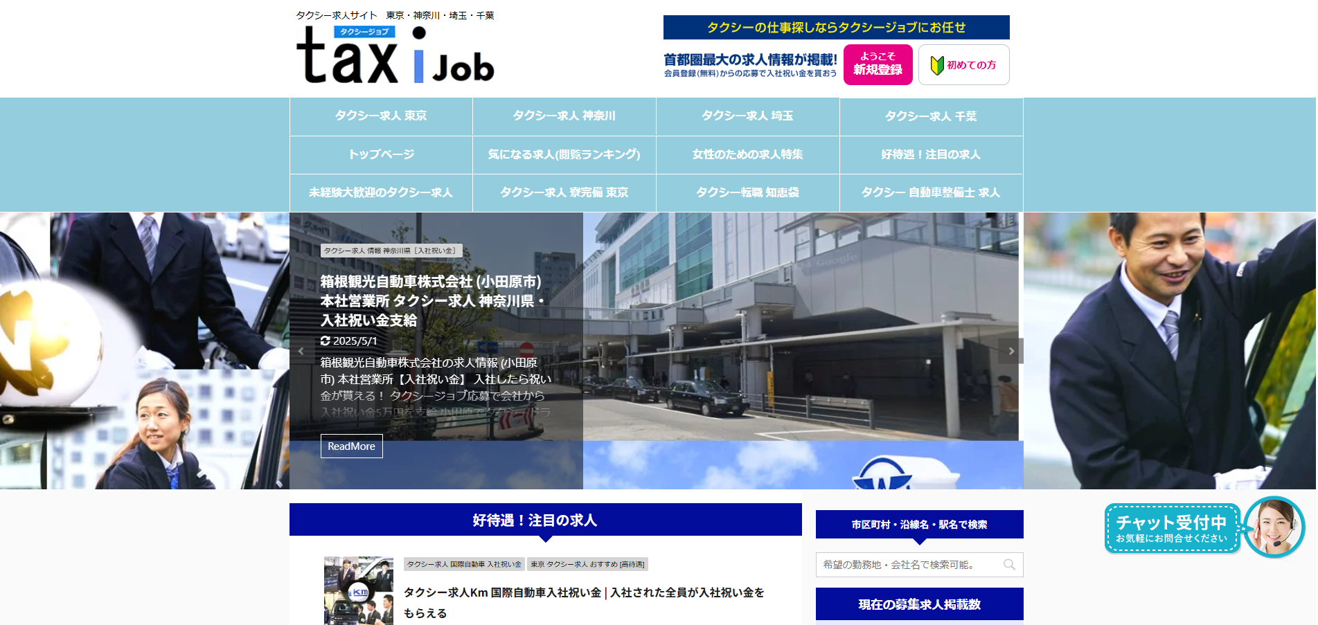 「タクシージョブ」は、東京都・神奈川県・埼玉県・千葉県を中心としたタクシードライバー専門の求人情報サイトです。未経験者や女性、シニア層など幅広い求職者を対象に、各種サポートを提供しています。