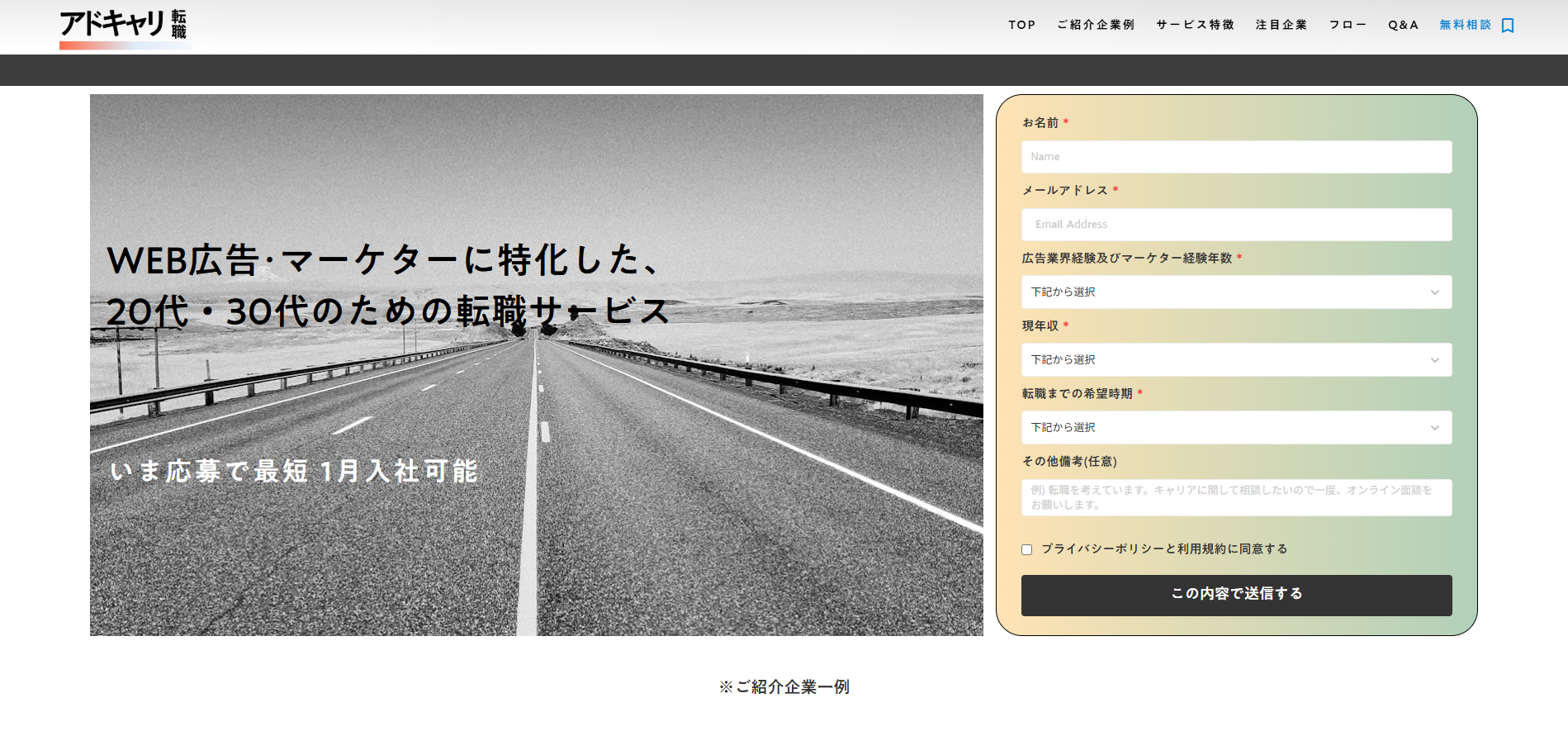 「アドキャリ転職」は、WEB広告・マーケティング領域に特化した転職支援サービスです。特に20代〜30代の若手から中堅を対象に、広告運用やデジタルマーケティングの求人を多数扱っている点が特徴。