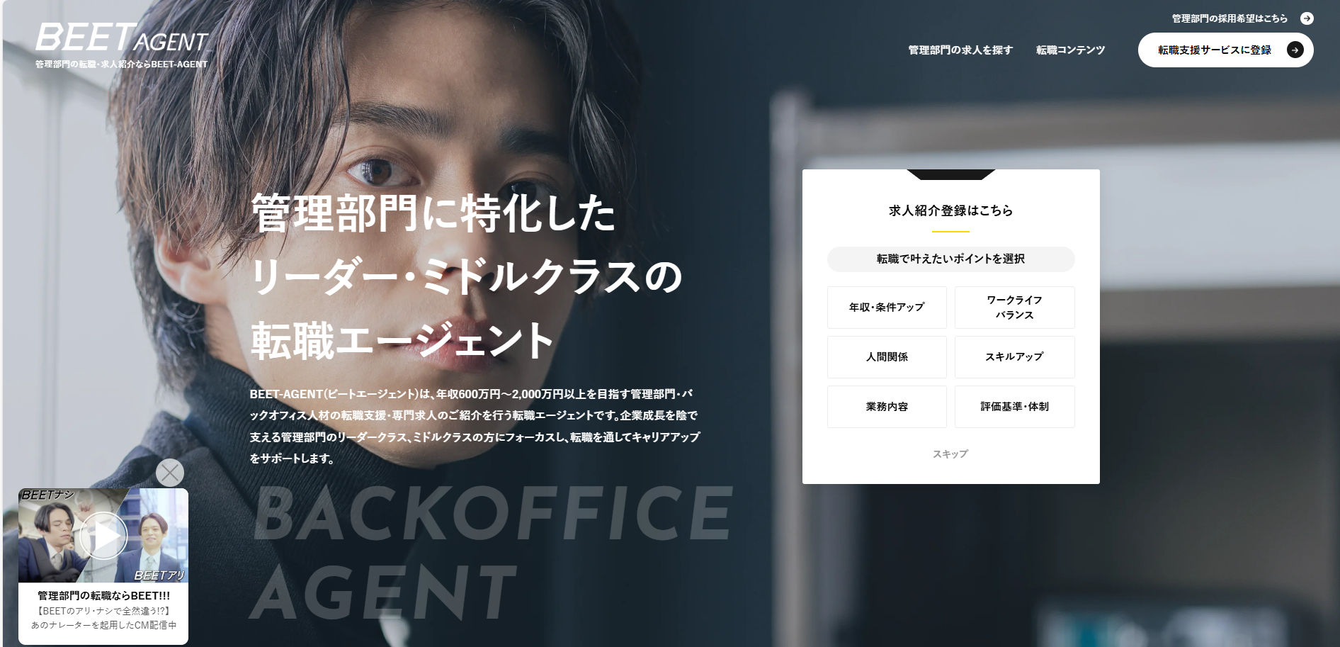 「BEET-AGENT」は、管理部門に特化した、リーダーやミドルクラスの転職エージェントです。